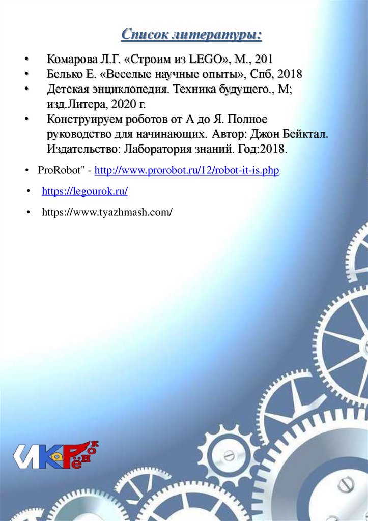 Список литературы:Комарова Л.Г. «Строим из LEGO», М., 201