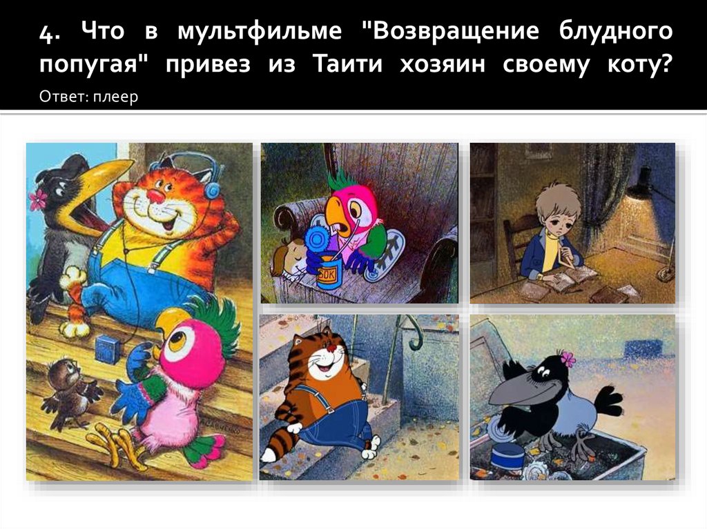 4. Что в мультфильме "Возвращение блудногопопугая" привез из Таити хозяин своему коту?