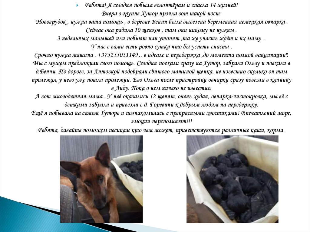"Новогрудок , нужна ваша помощь , в деревне Бенин была вывезена беременная немецкая овчарка .