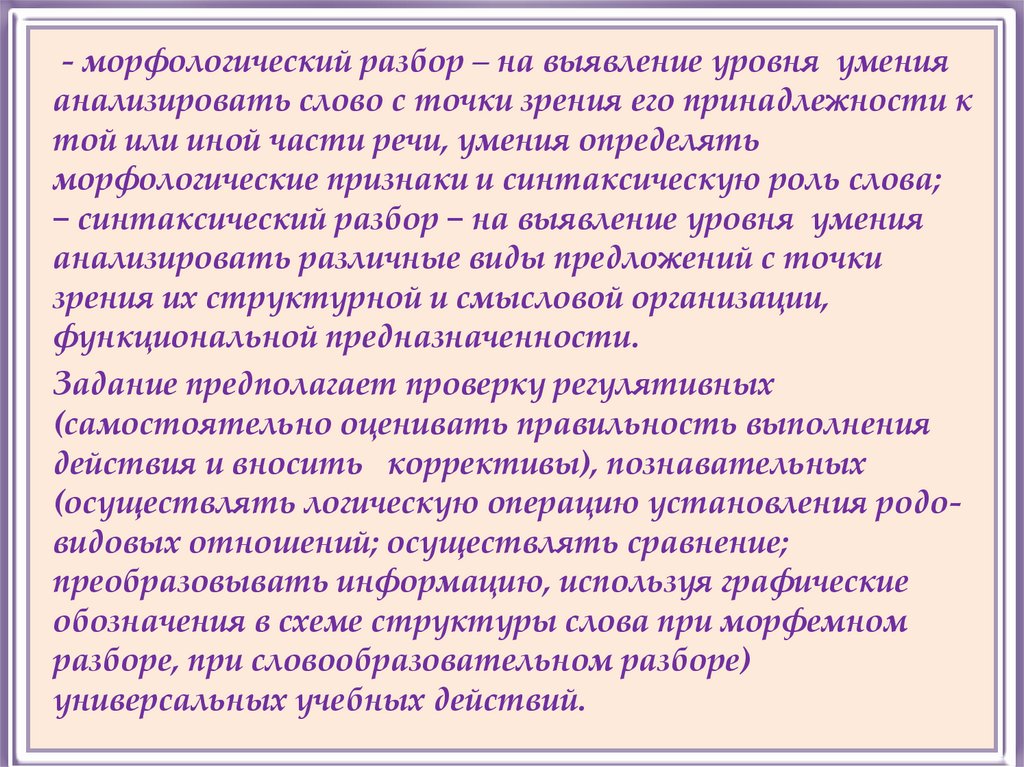 - морфологический разбор – на выявление уровня уменияанализировать слово с точки зрения его принадлежности к