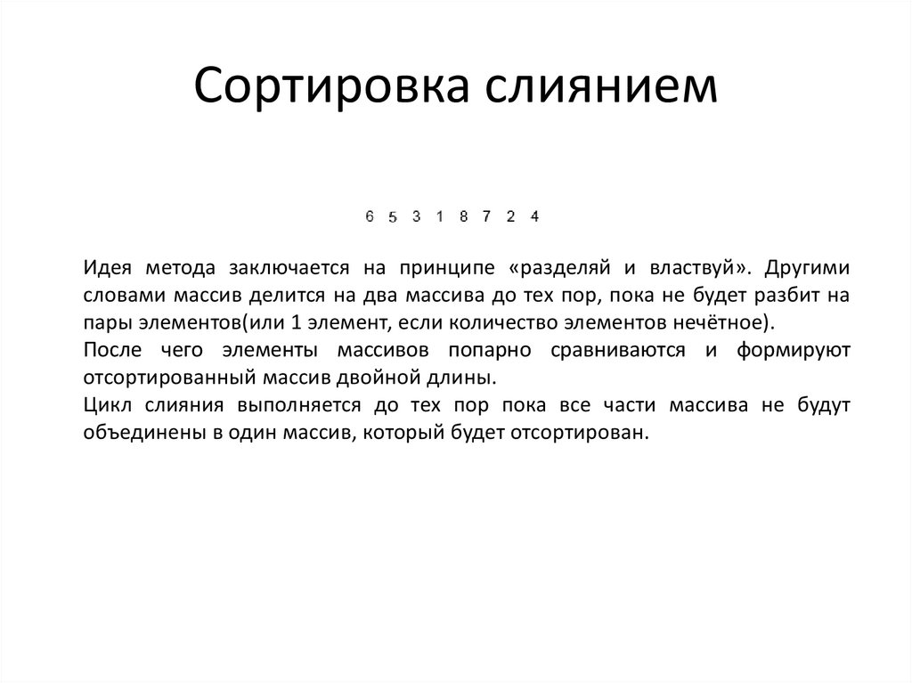 Сортировка слияниемИдея метода заключается на принципе «разделяй и властвуй». Другими