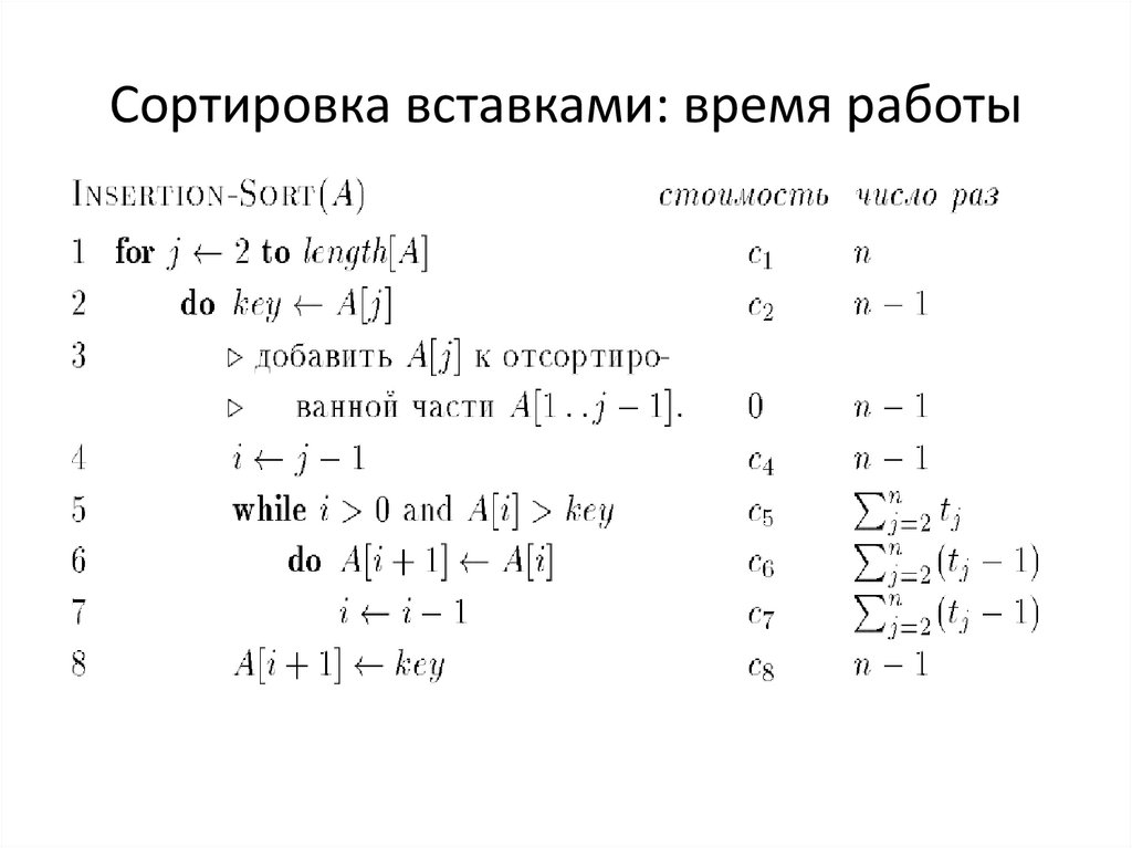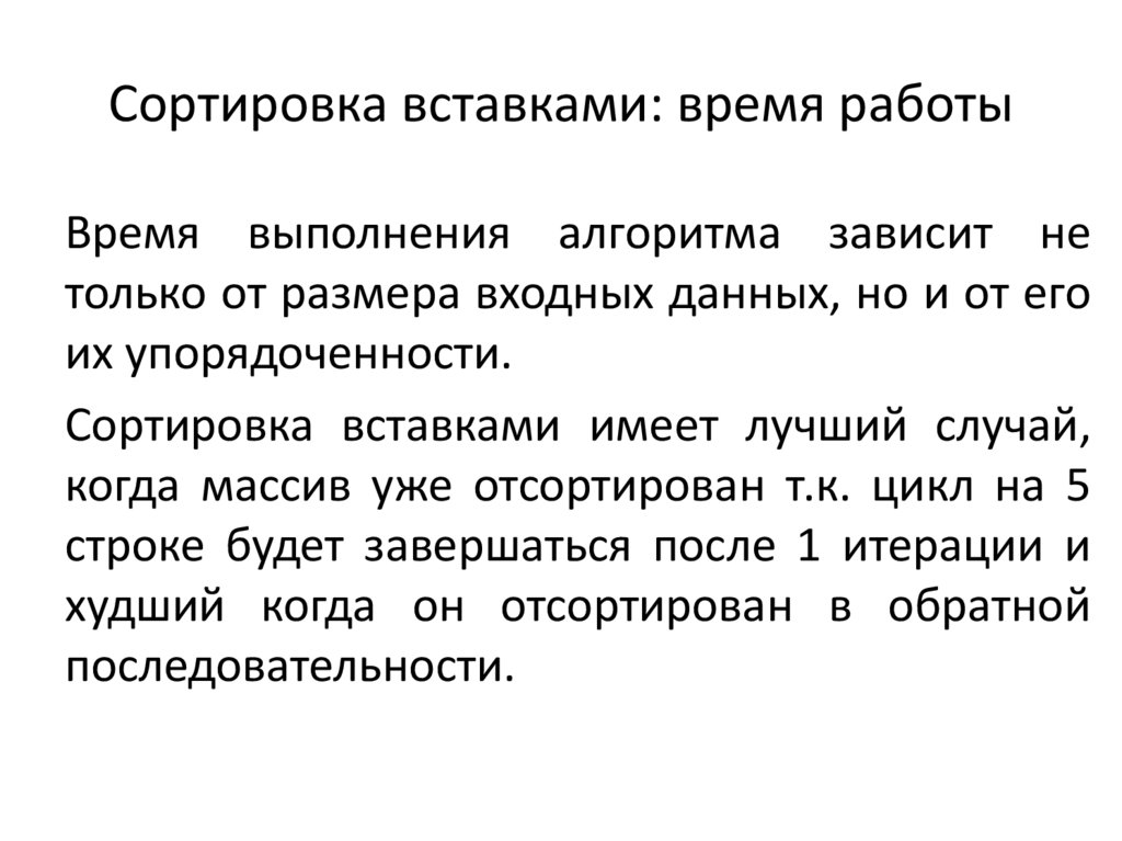 Сортировка вставками: время работыВремя выполнения алгоритма зависит не