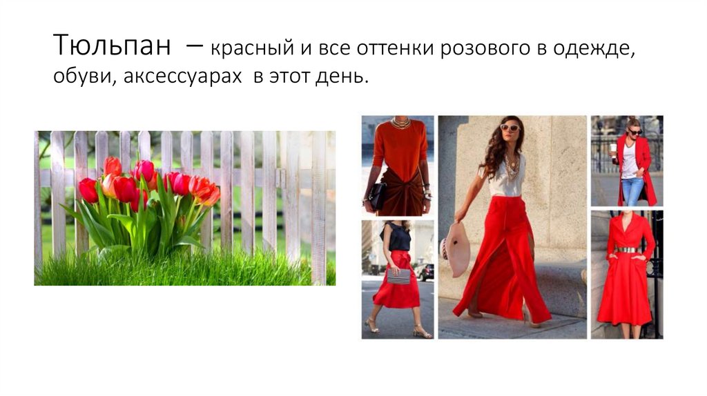 Тюльпан – красный и все оттенки розового в одежде,обуви, аксессуарах в этот день.