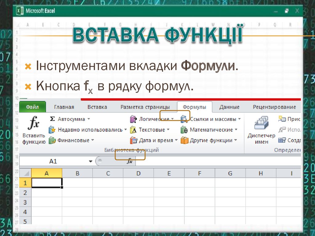 Інструментами вкладки Формули.Кнопка fx в рядку формул.