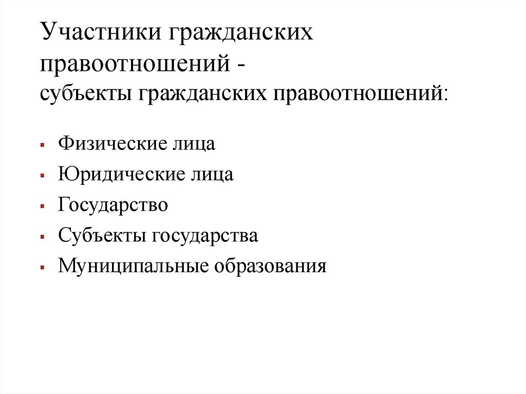 Участники гражданскихправоотношений субъекты гражданских правоотношений: