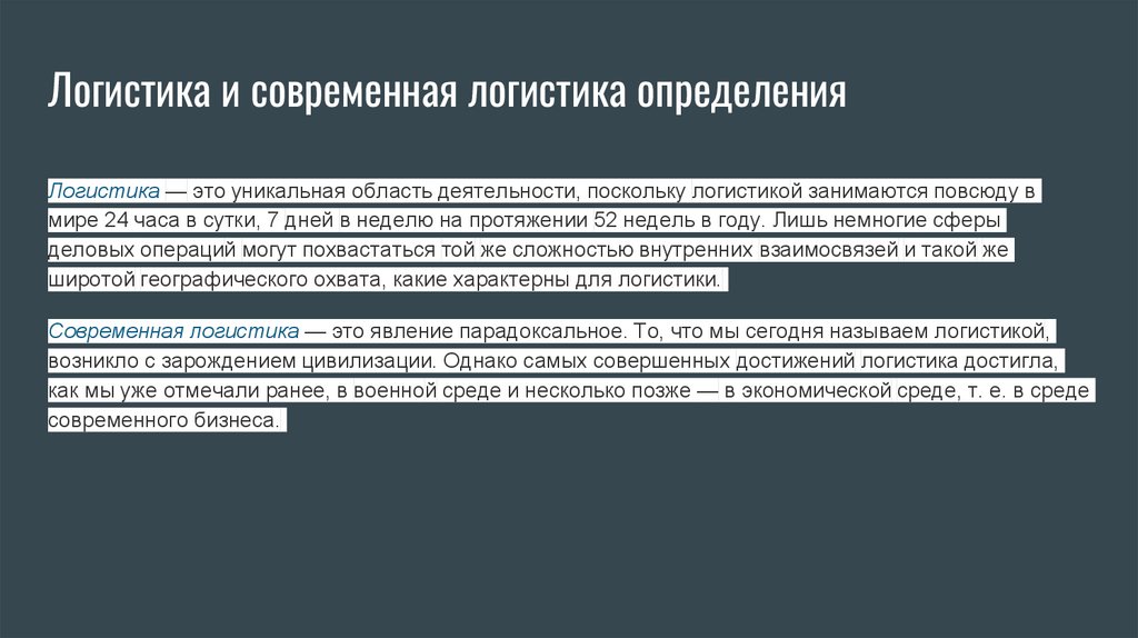 Логистика и современная логистика определенияЛогистика — это уникальная область деятельности, поскольку логистикой занимаются повсюду в