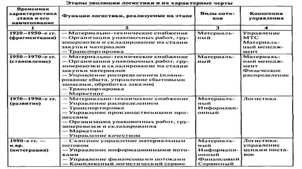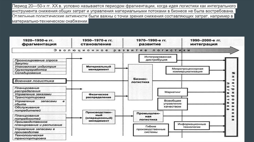 Период 20—50-х гг. XX в. условно называется периодом фрагментации, когда идея логистики как интегральногоинструмента снижения общих затрат и управления материальными потоками в бизнесе не была востребована.