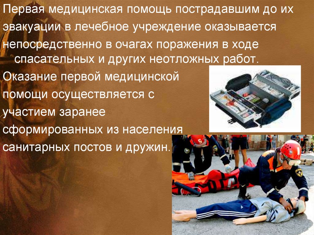 Первая медицинская помощь пострадавшим до ихэвакуации в лечебное учреждение оказывается