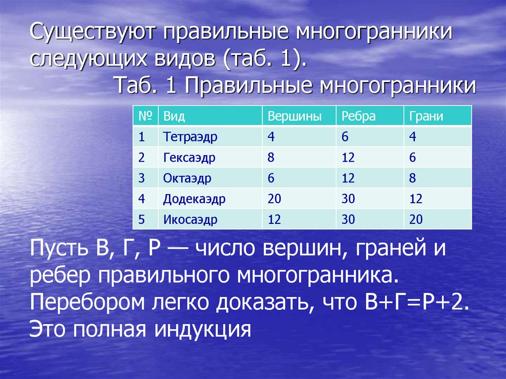 Существуют правильные многогранникиследующих видов (таб. 1).