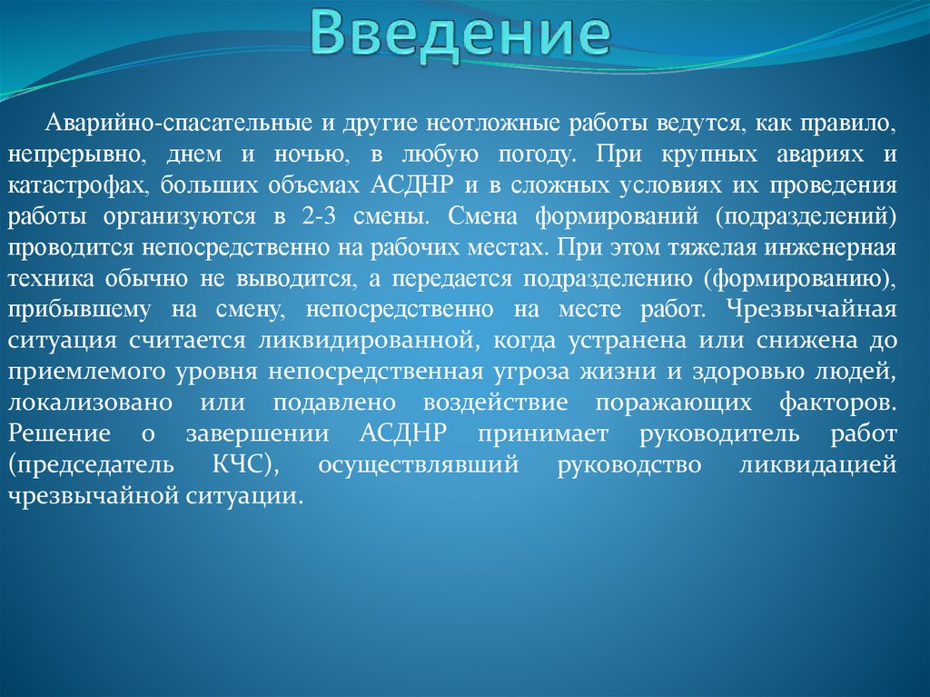 Аварийно-спасательные и другие неотложные работы ведутся, как правило,непрерывно, днем и ночью, в любую погоду. При крупных авариях и