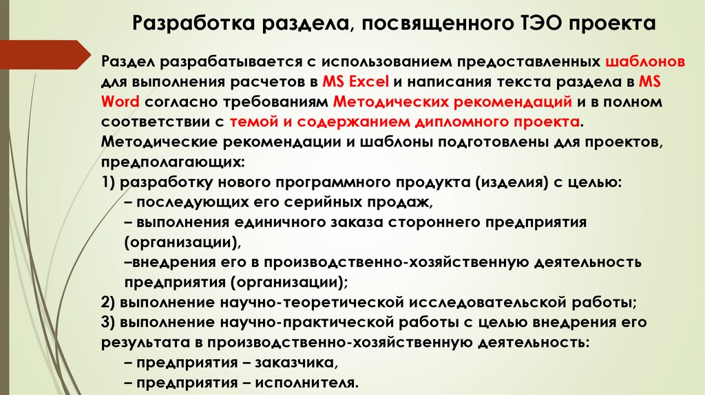 Разработка раздела, посвященного ТЭО проектаРаздел разрабатывается с использованием предоставленных шаблонов