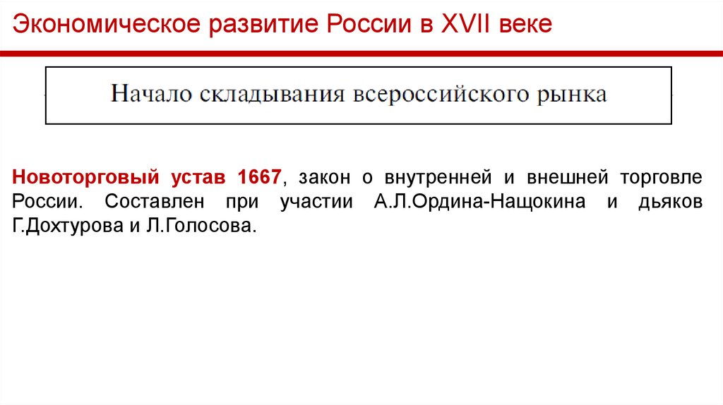 Экономическое развитие России в XVII векеНовоторговый устав 1667, закон о внутренней и внешней торговле