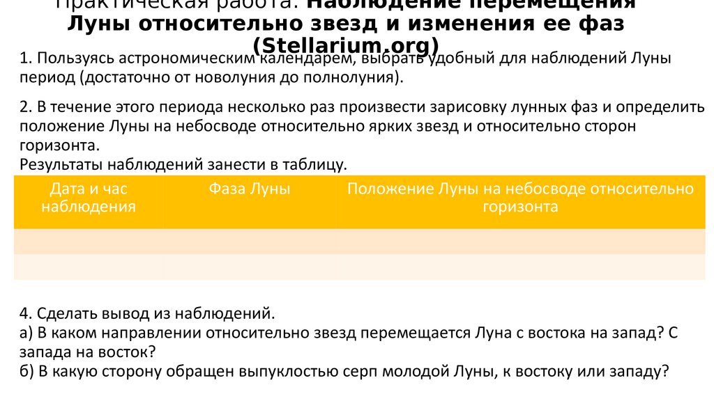 Практическая работа: Наблюдение перемещенияЛуны относительно звезд и изменения ее фаз