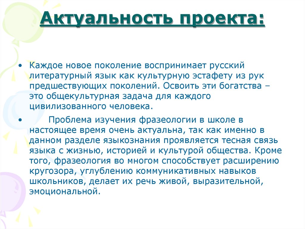 Актуальность проекта:• Каждое новое поколение воспринимает русский