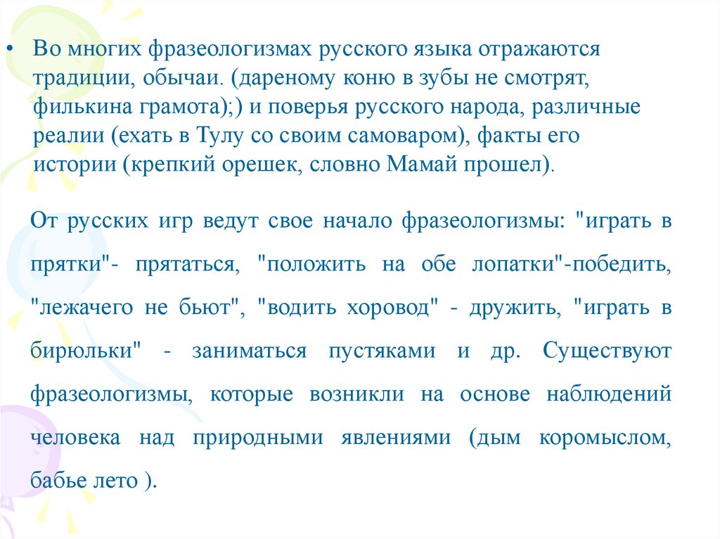 • Во многих фразеологизмах русского языка отражаютсятрадиции, обычаи. (дареному коню в зубы не смотрят,