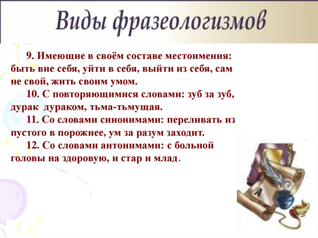 9. Имеющие в своём составе местоимения:быть вне себя, уйти в себя, выйти из себя, сам