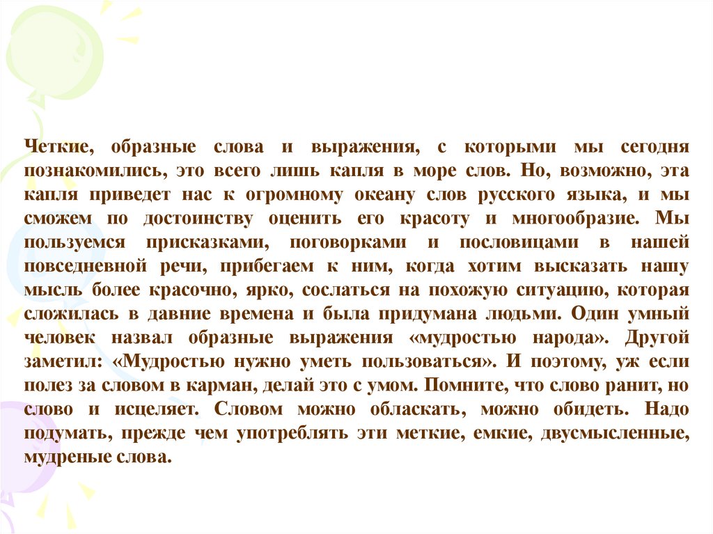 Четкие, образные слова и выражения, с которыми мы сегодняпознакомились, это всего лишь капля в море слов. Но, возможно, эта