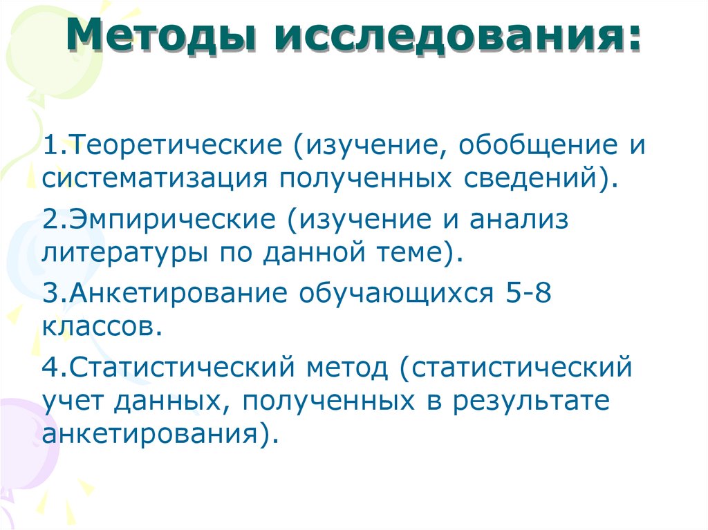 Методы исследования:1.Теоретические (изучение, обобщение и
