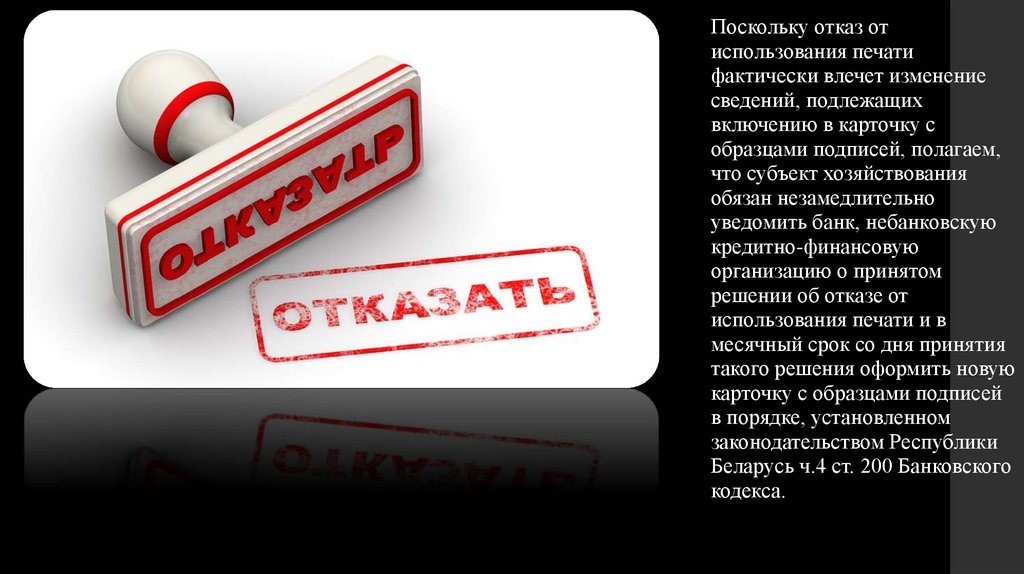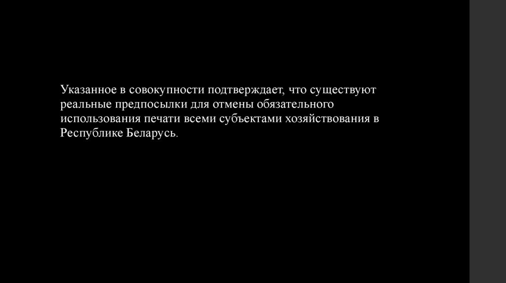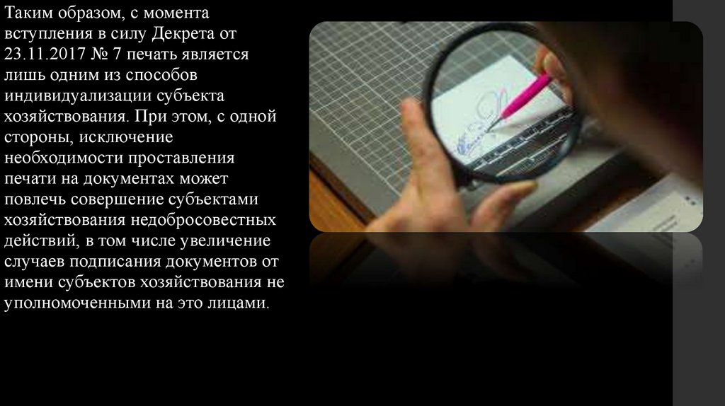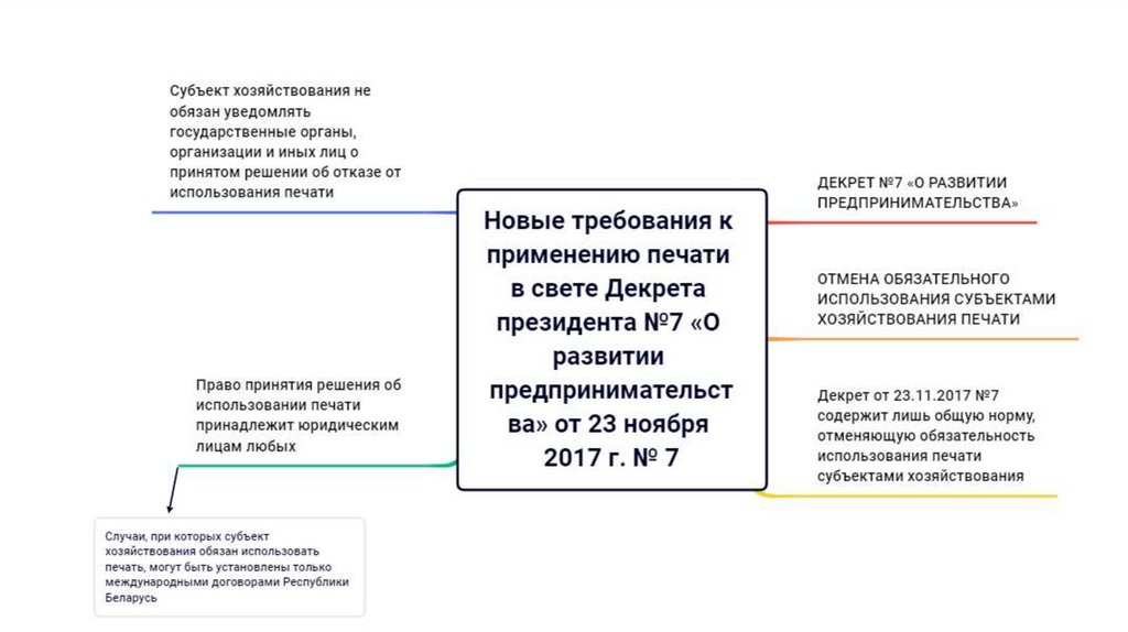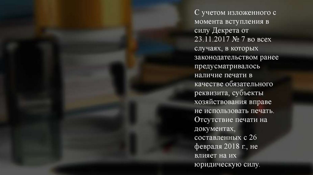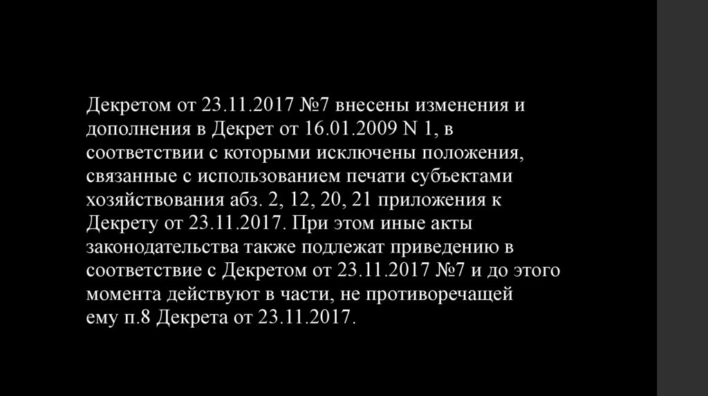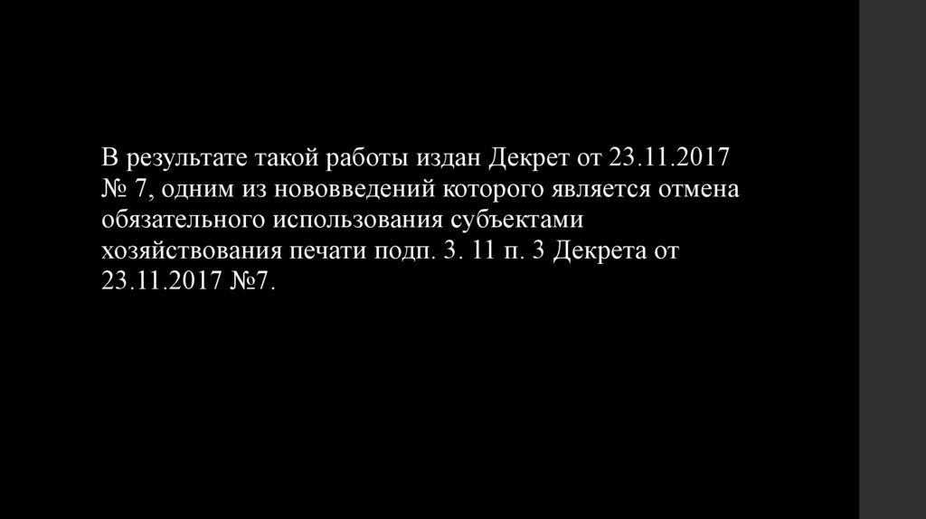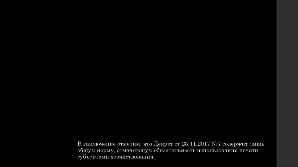 В заключение отметим, что Декрет от 23.11.2017 №7 содержит лишьобщую норму, отменяющую обязательность использования печати