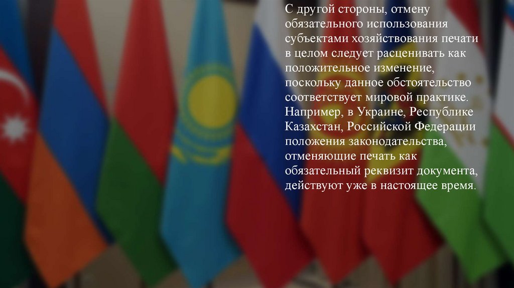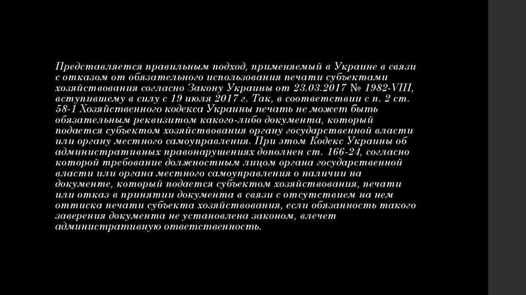 Представляется правильным подход, применяемый в Украине в связис отказом от обязательного использования печати субъектами
