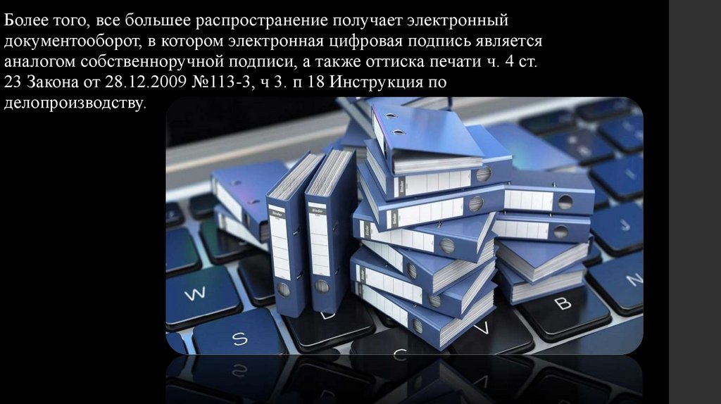 Более того, все большее распространение получает электронныйдокументооборот, в котором электронная цифровая подпись является