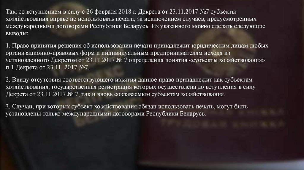 Так, со вступлением в силу с 26 февраля 2018 г. Декрета от 23.11.2017 №7 субъектыхозяйствования вправе не использовать печати, за исключением случаев, предусмотренных