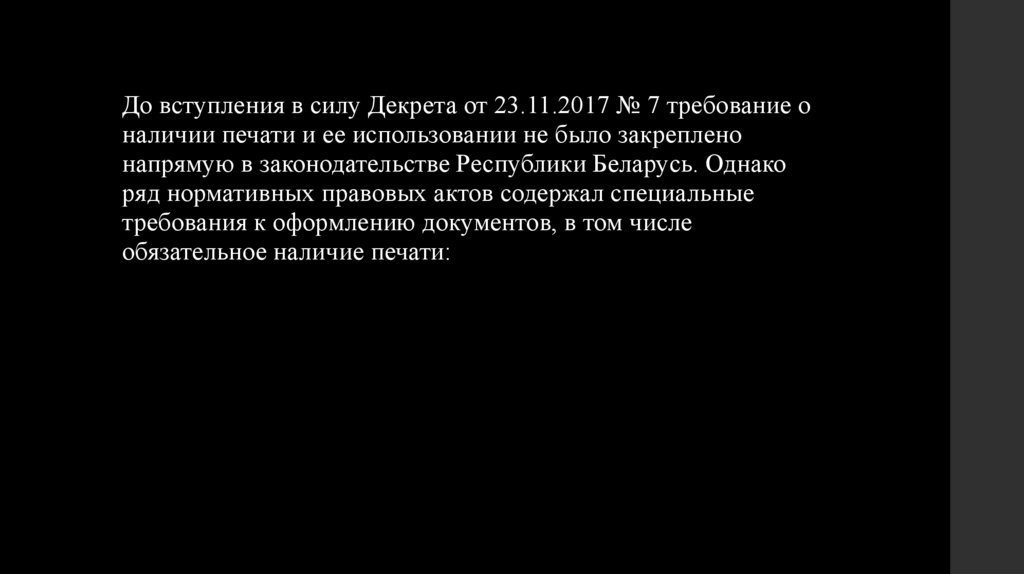 До вступления в силу Декрета от 23.11.2017 № 7 требование оналичии печати и ее использовании не было закреплено