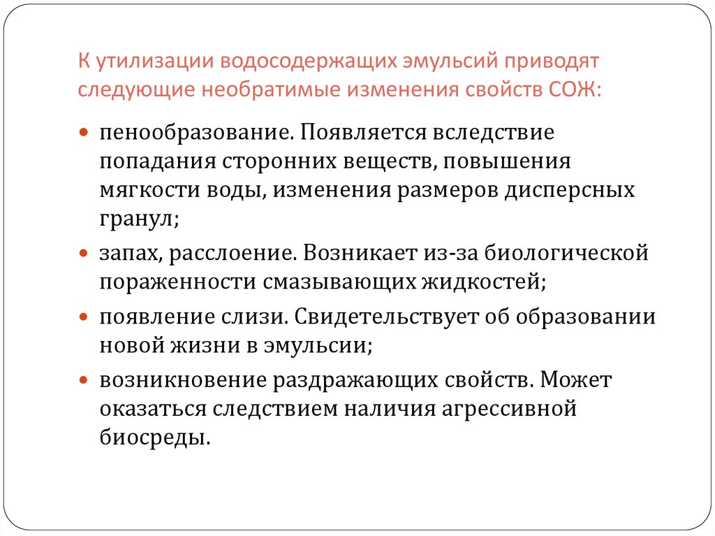 К утилизации водосодержащих эмульсий приводятследующие необратимые изменения свойств СОЖ: