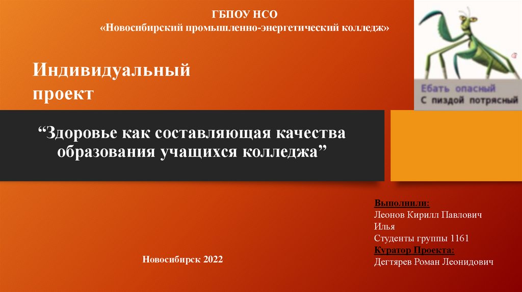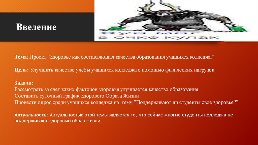 ВведениеТема: Проект “Здоровье как составляющая качества образования учащихся колледжа”