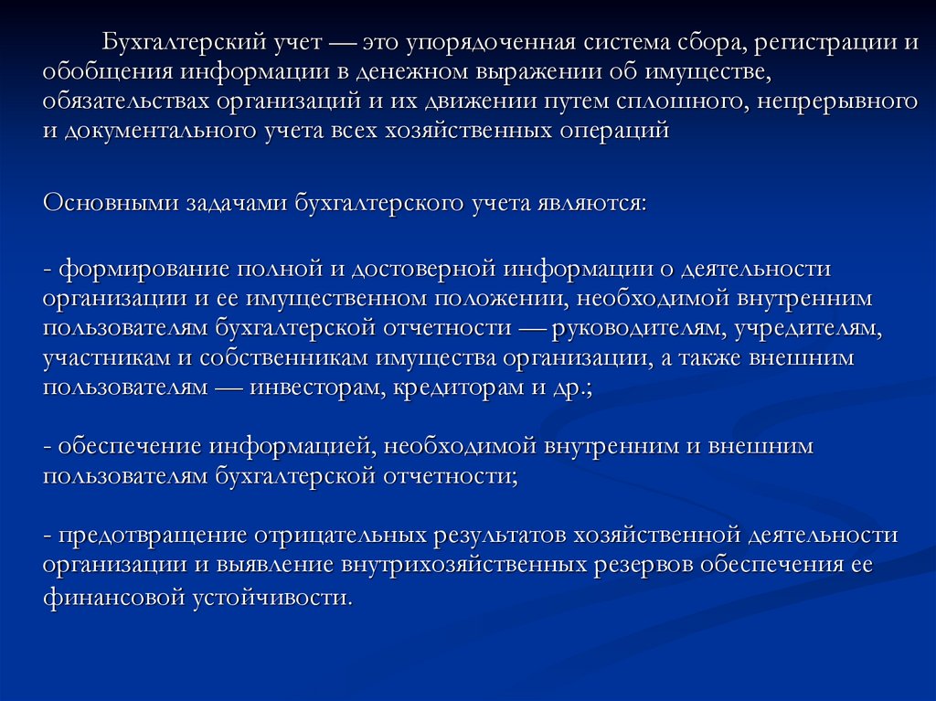 Бухгалтерский учет — это упорядоченная система сбора, регистрации иобобщения информации в денежном выражении об имуществе,