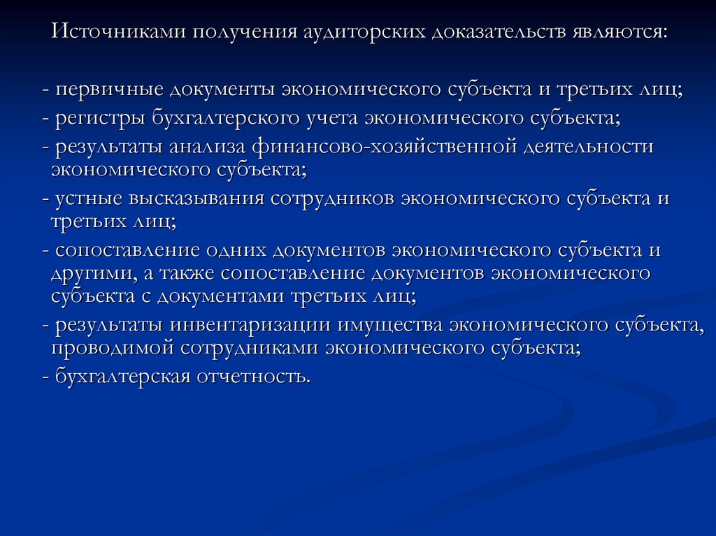Источниками получения аудиторских доказательств являются:- первичные документы экономического субъекта и третьих лиц;