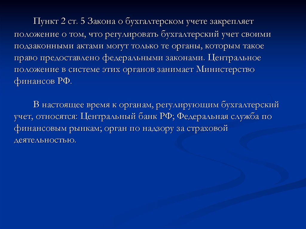 Пункт 2 ст. 5 Закона о бухгалтерском учете закрепляетположение о том, что регулировать бухгалтерский учет своими