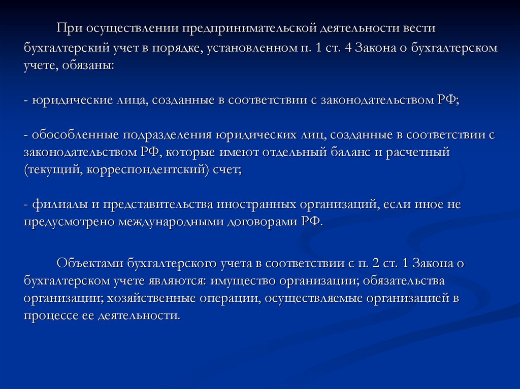 При осуществлении предпринимательской деятельности вестибухгалтерский учет в порядке, установленном п. 1 ст. 4 Закона о бухгалтерском