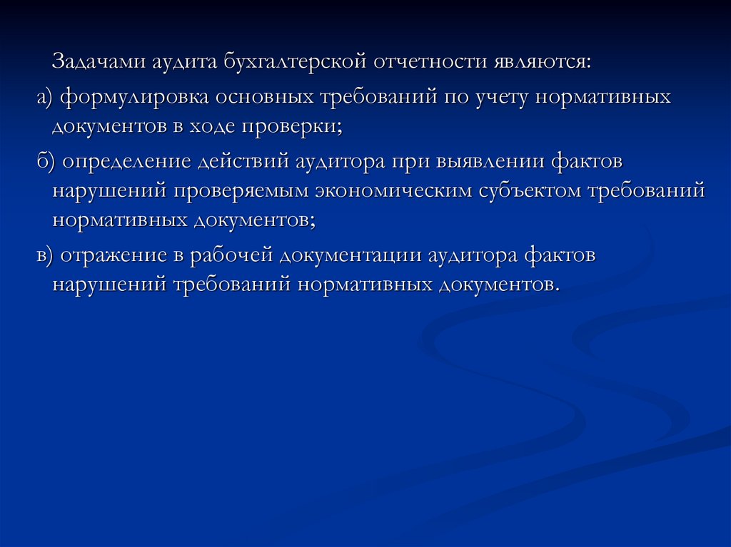 Задачами аудита бухгалтерской отчетности являются:а) формулировка основных требований по учету нормативных