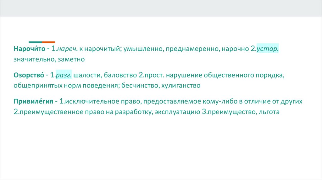 Нарочи́то - 1.нареч. к нарочитый; умышленно, преднамеренно, нарочно 2.устар.значительно, заметно