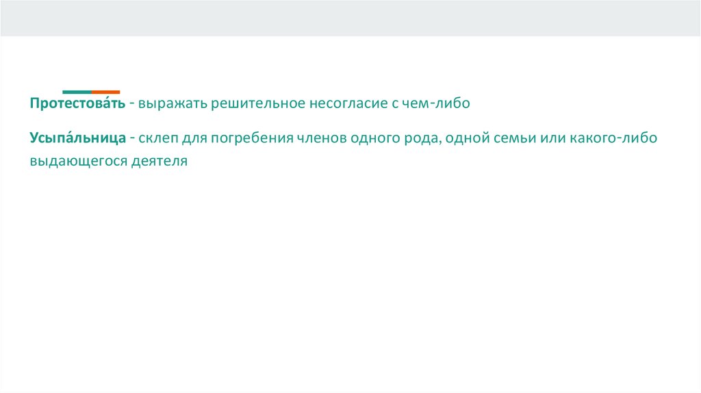 Протестова́ть - выражать решительное несогласие с чем-либоУсыпа́льница - склеп для погребения членов одного рода, одной семьи или какого-либо
