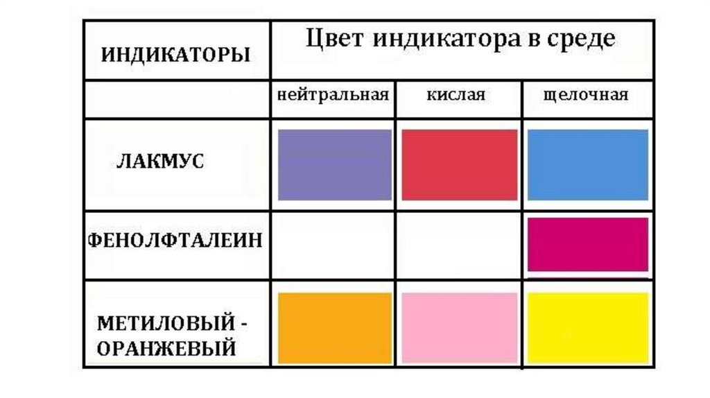 2) названия трёх кислотно-основных индикаторов и как они меняют цвета в разных растворах (слайд 11-12 в