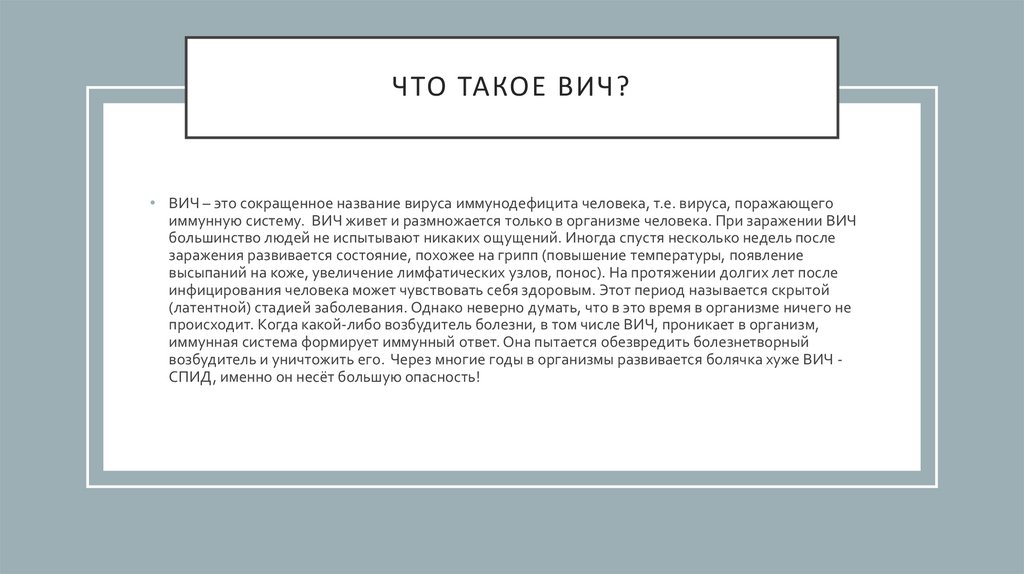 ЧТО ТАКОЕ ВИЧ?• ВИЧ – это сокращенное название вируса иммунодефицита человека, т.е. вируса, поражающего