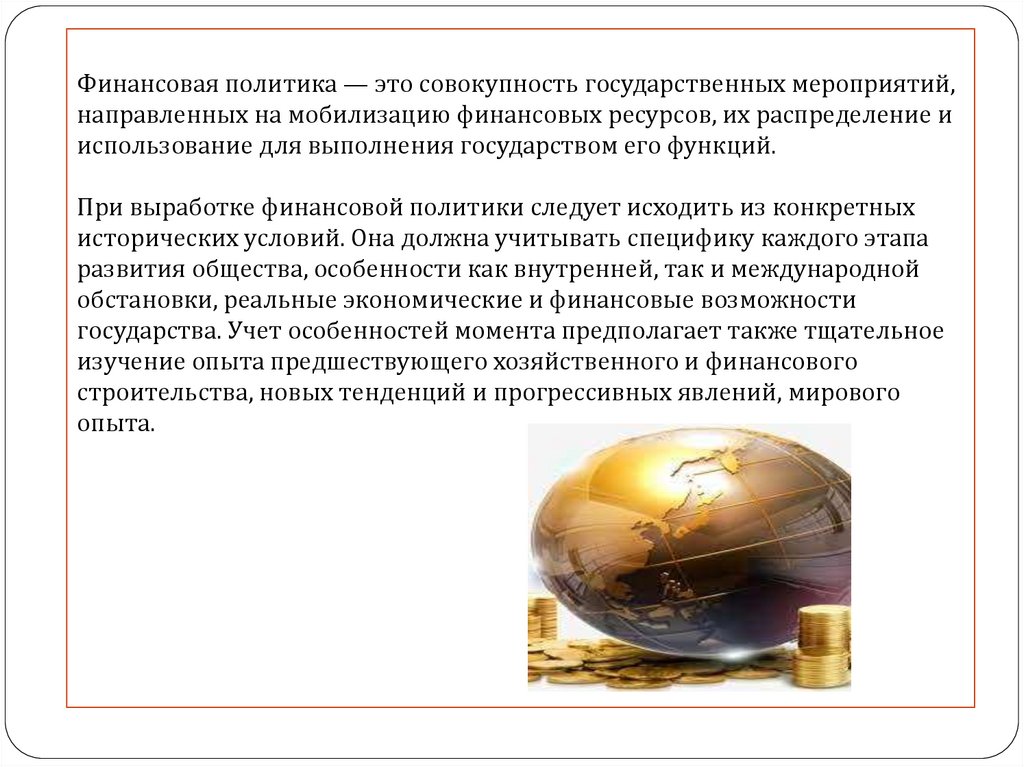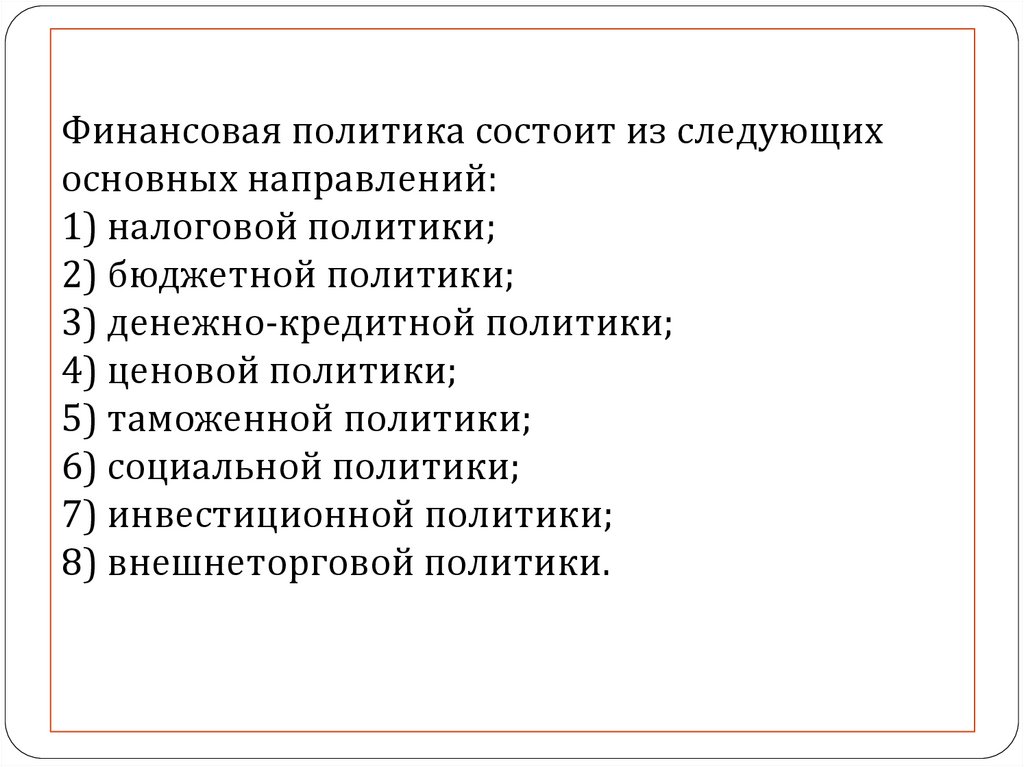 Финансовая политика — это совокупность государственных мероприятий,направленных на мобилизацию финансовых ресурсов, их распределение и
