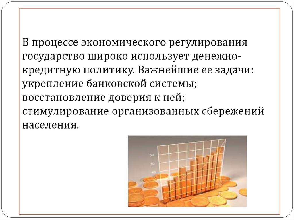 В процессе экономического регулированиягосударство широко использует денежнокредитную политику. Важнейшие ее задачи: