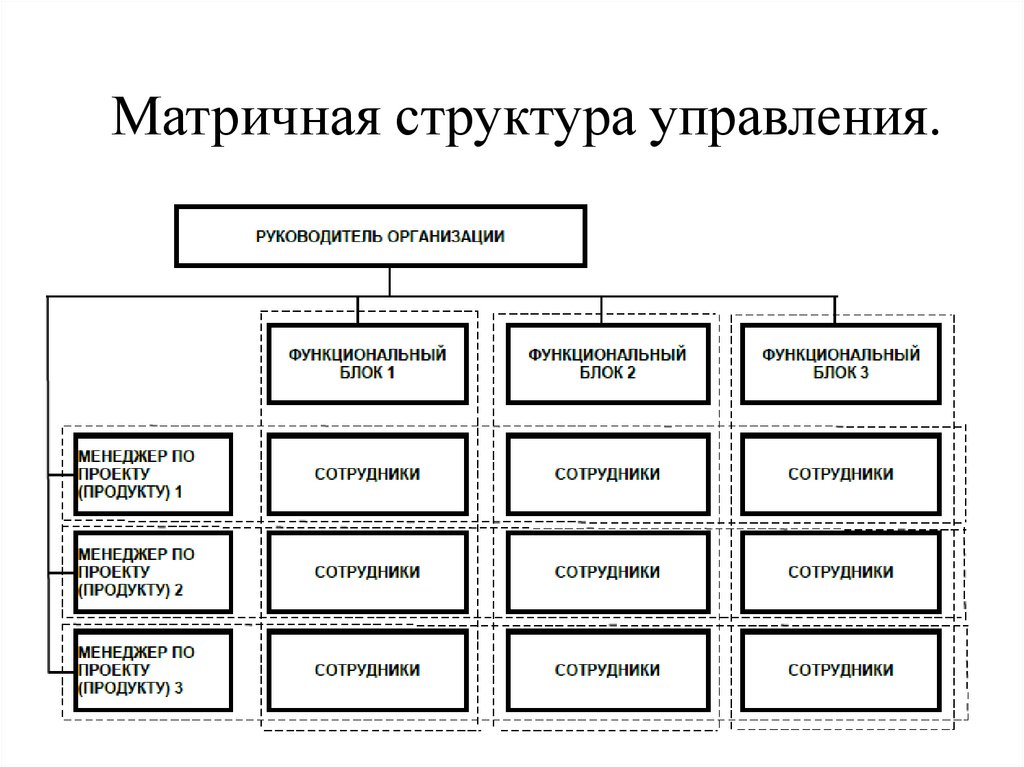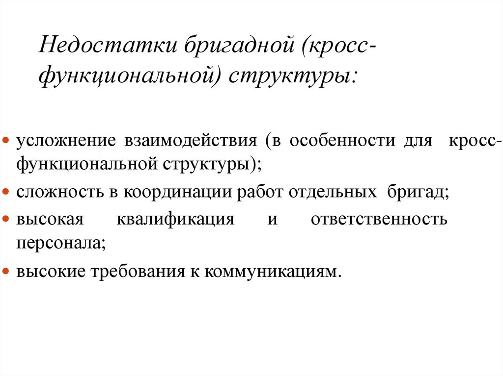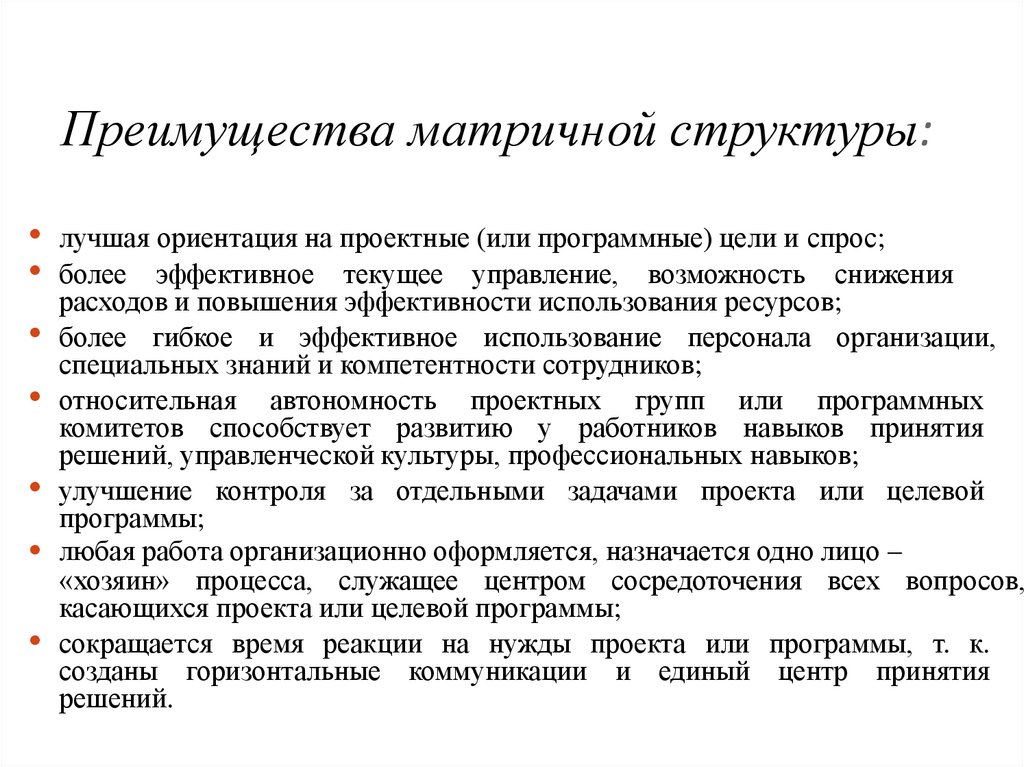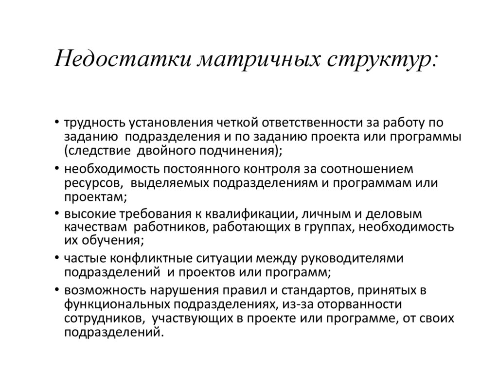 Недостатки матричных структур:• трудность установления четкой ответственности за работу по