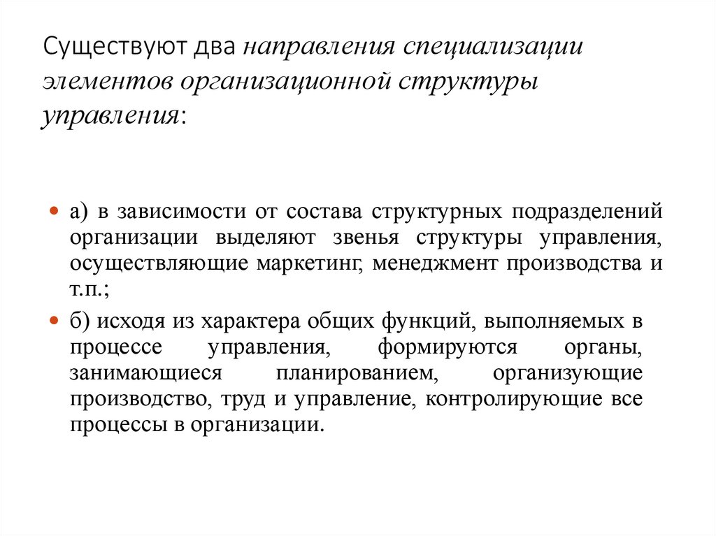 Существуют два направления специализацииэлементов организационной структуры