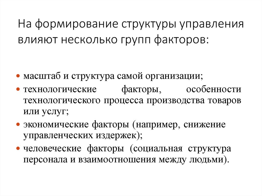 На формирование структуры управлениявлияют несколько групп факторов: