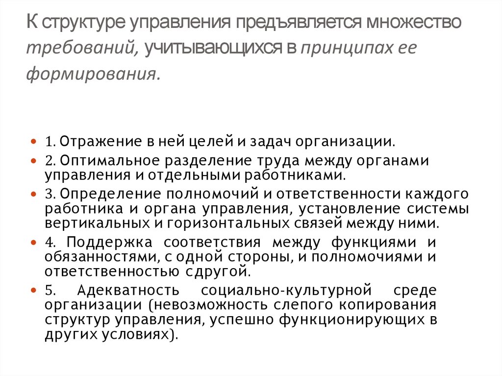 К структуре управления предъявляется множествотребований, учитывающихся в принципах ее