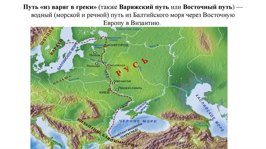 Путь «из варяг в греки» (также Варяжский путь или Восточный путь) —водный (морской и речной) путь из Балтийского моря через Восточную
