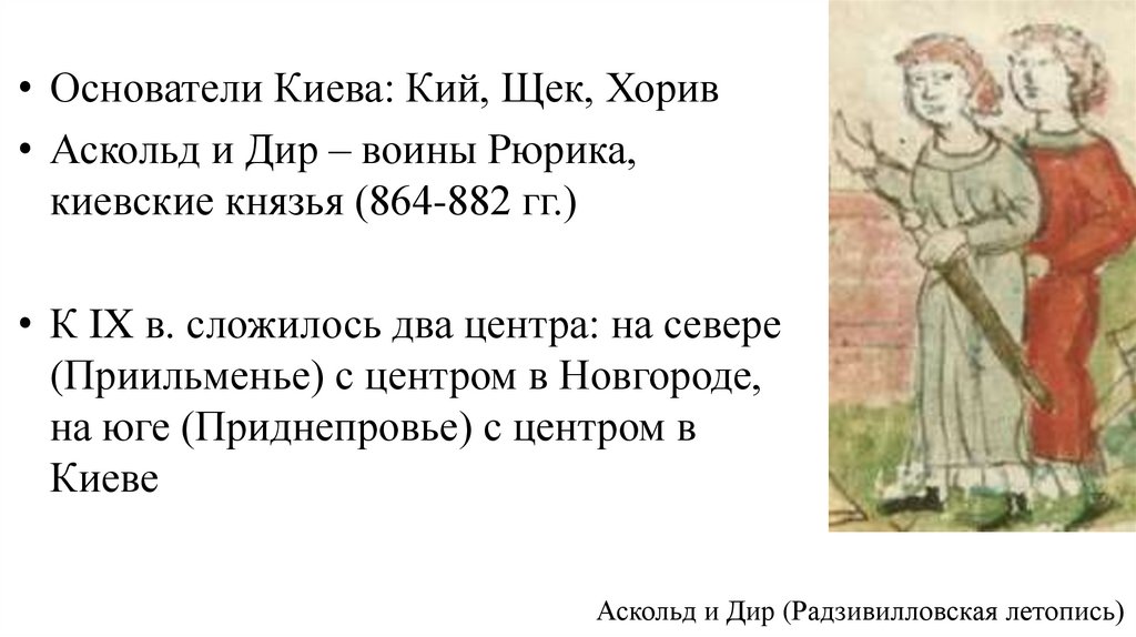 • Основатели Киева: Кий, Щек, Хорив• Аскольд и Дир – воины Рюрика,