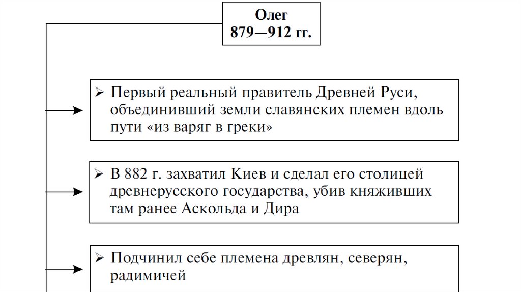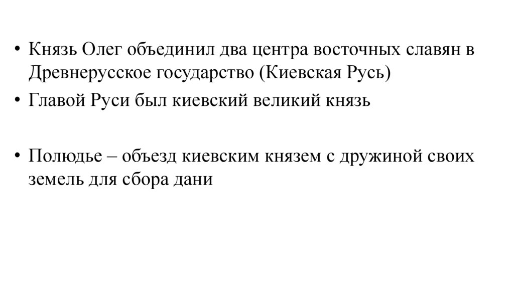 • Князь Олег объединил два центра восточных славян вДревнерусское государство (Киевская Русь)