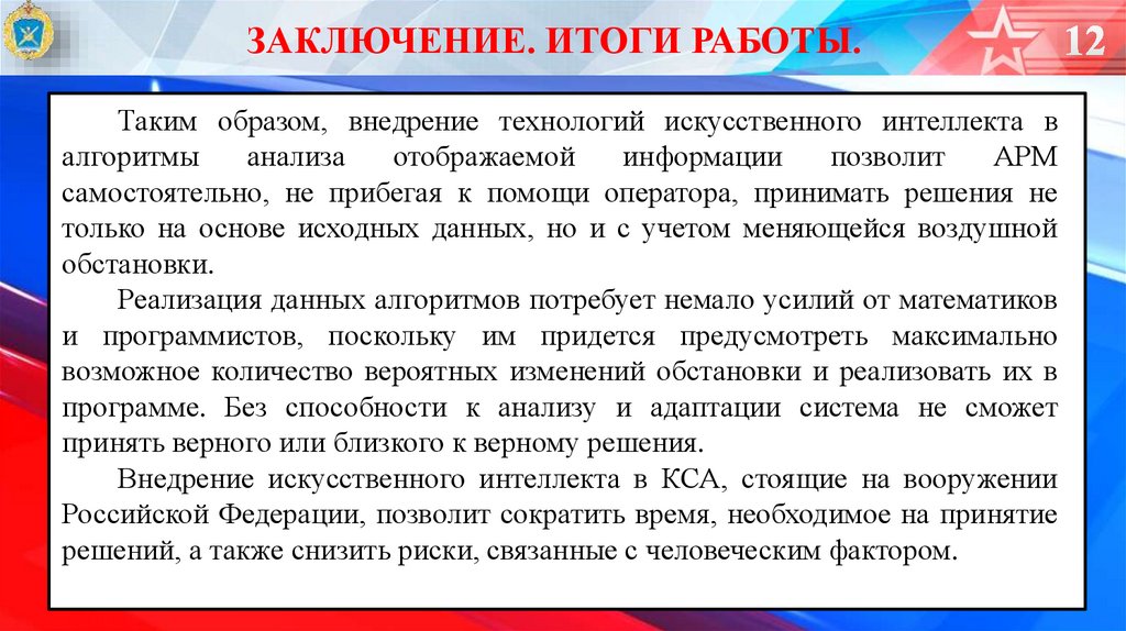 ЗАКЛЮЧЕНИЕ. ИТОГИ РАБОТЫ.Таким образом, внедрение технологий искусственного интеллекта в