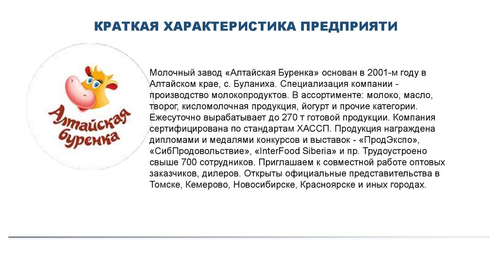 КРАТКАЯ ХАРАКТЕРИСТИКА ПРЕДПРИЯТИМолочный завод «Алтайская Буренка» основан в 2001-м году в