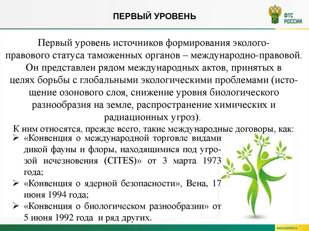 ПЕРВЫЙ УРОВЕНЬПервый уровень источников формирования экологоправового статуса таможенных органов – международно-правовой.